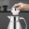 Convenient push-button lid allows smooth, controlled pouring with one hand.