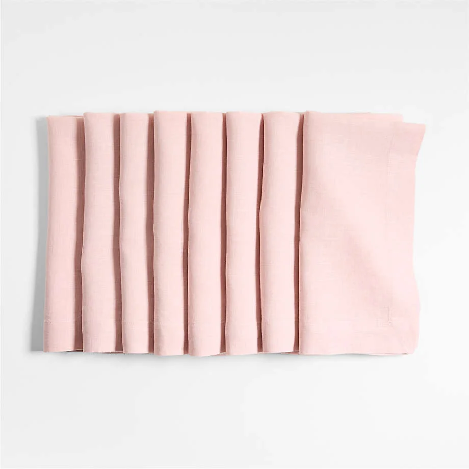 Each pastel pink napkin unfolds to a generous 22-inch square, pre-washed for extra softness. Tailored with mitered corners, the eight linen napkins in the set pair beautifully with our modern dinnerware and clean up easily in the washing machine and dryer.
